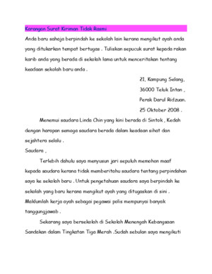 Jun 16, 2020 · surat kiriman rasmi tersebut mestilah tidak terlalu panjang atau meleret dan mempunyai beberapa perenggan. Apr 20, 2021 · selain surat rasmi, terdapat 1 lagi jenis surat yang ditulis untuk kegunaan tidak rasmi iaitu surat kiriman tidak rasmi. Dikongsikan di sini, contoh karangan surat kiriman rasmi yang ditulis untuk tujuan pelbagai urusan termasuk permohonan kerja, bantuan kerajaan, aduan kepada agensi kerajaan, sumbangan derma, jemputan, surat rayuan kemasukan ke institusi pendidikan di malaysia. Penomboran perenggan perlu dimulakan pada perenggan kedua dan seterusnya. Contoh karangan penulisan yang diberikan di bawah boleh dijadikan sebagai rujukan dan panduan bagi para pelajar pt3 untuk menulis karangan surat kiriman tidak rasmi yang terbaik dari segi kualiti dan mutunya mengikut format yang telah ditetapkan.